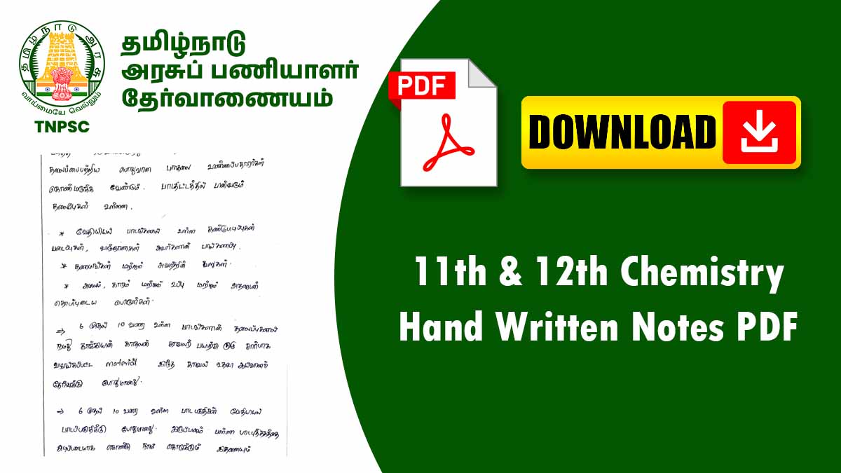 11th மற்றும் 12th Chemistry பாடங்களில் அதிகமான concepts மற்றும் formulas இருப்பதால், students-க்கு revision நேரத்தில் confusion ஆகும். அதனால், இங்கே 11th & 12th Chemistry Handwritten Notes PDF வடிவில் மிகவும் எளிய மொழியில், chapter-wise சரியாக கொடுக்கப்பட்டிருக்கிறது.