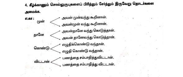 4.கீழ்க்காணும் சொல்லுருபுகளைப் பிரித்தும் சேர்த்தும் இருவேறு தொடர்களை அமைக்க