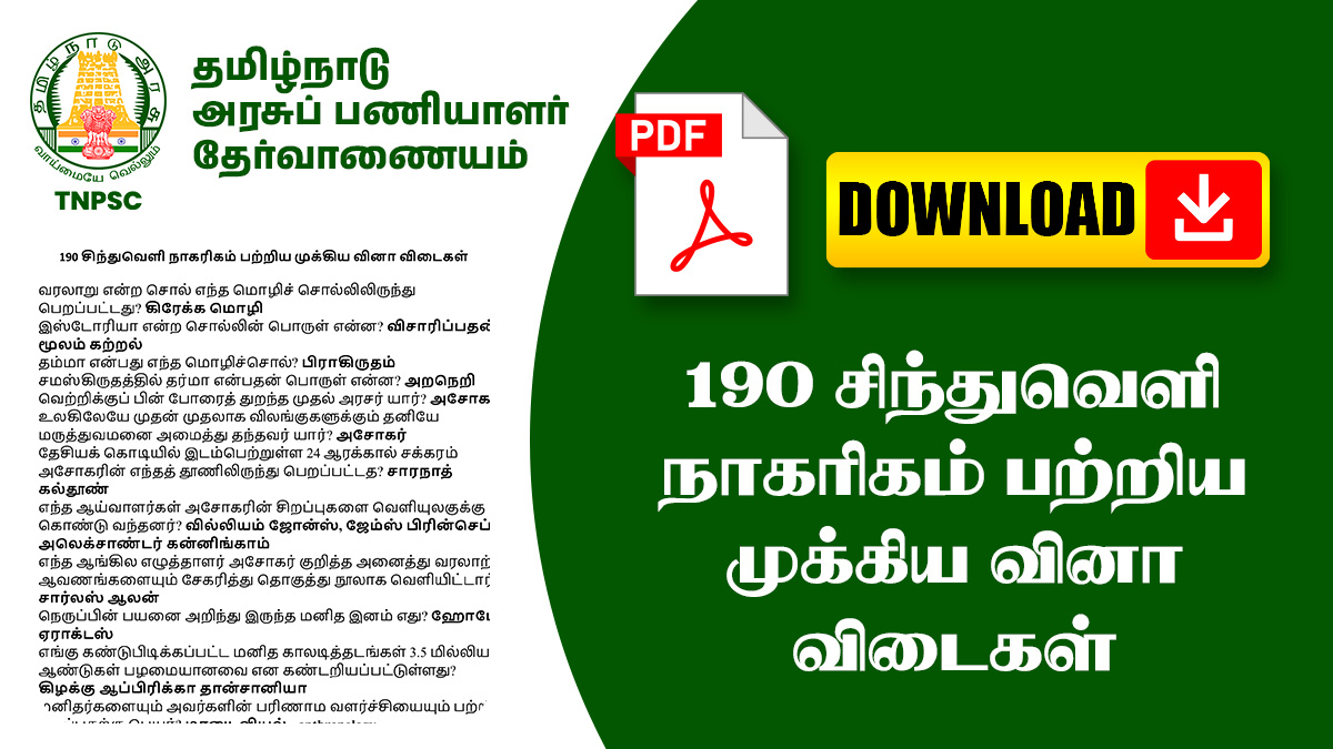 🚀 190 சிந்துவெளி நாகரிகம் பற்றிய முக்கிய வினா விடைகள் – பதிவிறக்கம் செய்து, உங்கள் தேர்வு தயாரிப்பை மேம்படுத்துங்கள்!