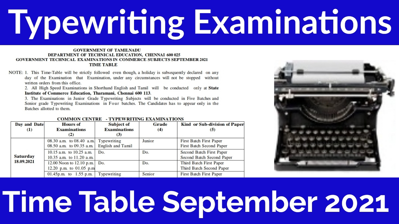 ஆங்கிலம் மற்றும் தமிழ் TYPEWRITING தேர்வுகள் வரும் 18.09.2021 & 19.09.2021 ஆகிய தேதிகளிலும், ACCOUNTANCY தேர்வுகள் 24.09.2021 அன்றும் நடைபெறவுள்ளது. அதேபோல், SHORTHAND தேர்வுகள் வரும் 25.09.2021 & 26.09.2021 ஆகிய தேதிகளிலும், SHORTHAND – HIGH SPEED தேர்வுகள் வரும் 27.09.2021 & 28.09.2021 ஆகிய தேதிகளிலும் நடைபெறவுள்ளது.