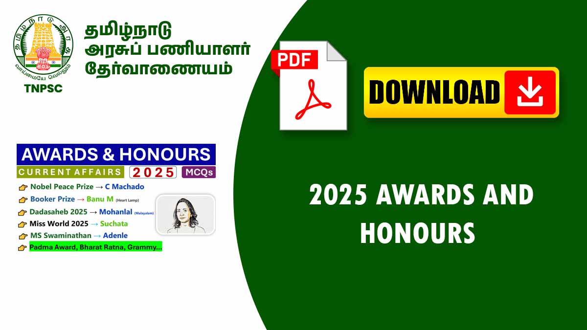 போட்டித் தேர்வுகளில் “Awards and Honours” பகுதி முக்கியமானது. சமூக, அறிவியல், விளையாட்டு, திரைப்படம், இலக்கியம், மற்றும் சேவை துறைகளில் வழங்கப்படும் விருதுகள் பற்றிய கேள்விகள் அடிக்கடி கேட்கப்படுகின்றன.