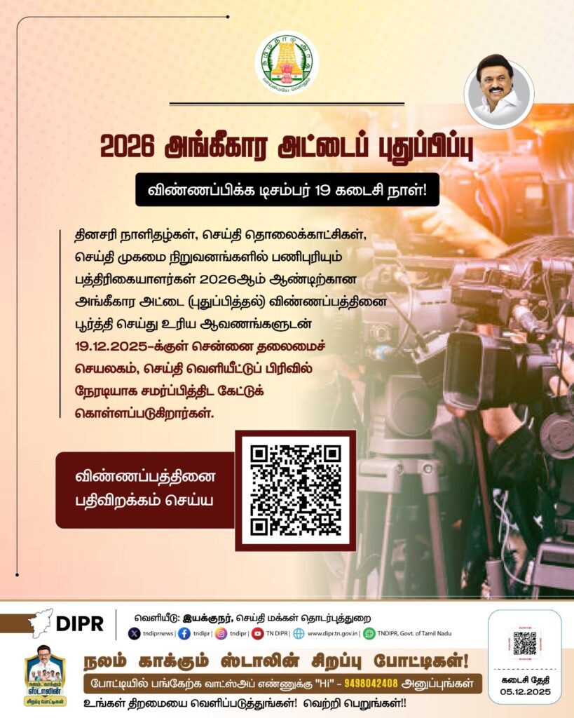 தமிழகத்தில் பணிபுரியும் தினசரி நாளிதழ்கள், செய்தித் தொலைக்காட்சிகள், செய்தி முகமை நிறுவனங்களில் உள்ள பத்திரிகையாளர்களுக்கான 2026 ஆம் ஆண்டிற்கான அங்கீகார அட்டை (Press ID Card) புதுப்பிப்பு தொடங்கியுள்ளது. இந்த ஆண்டு புதுப்பிப்பு விண்ணப்பத்தைச் சமர்ப்பிப்பதற்கான கடைசி நாள் டிசம்பர் 19, 2025 என தகவல் வெளியிடப்பட்டுள்ளது.
