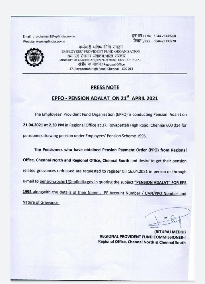 சென்னை வடக்கு மற்றும் தெற்கு பிராவிடெண்ட் ஃபண்ட் (பி.எஃப்) அலுவலகம் மூலம் ஓய்வூதியம் பெறுவோருக்கான குறைதீர்ப்பு கூட்டம் 2021, ஏப்ரல்-21-ம் தேதி (புதன்கிழமை) நடைபெற உள்ளது. சென்னை, ராயப்பேட்டையில் உள்ள மண்டல வருங்கால வைப்புநிதி அலுவலகத்தின் (Employees’ Provident Fund Regional Office,Chennai) சார்பாக பிற்பகல் 2.30 மணியளவில் இந்தக் கூட்டம் நடைபெறுகிறது.