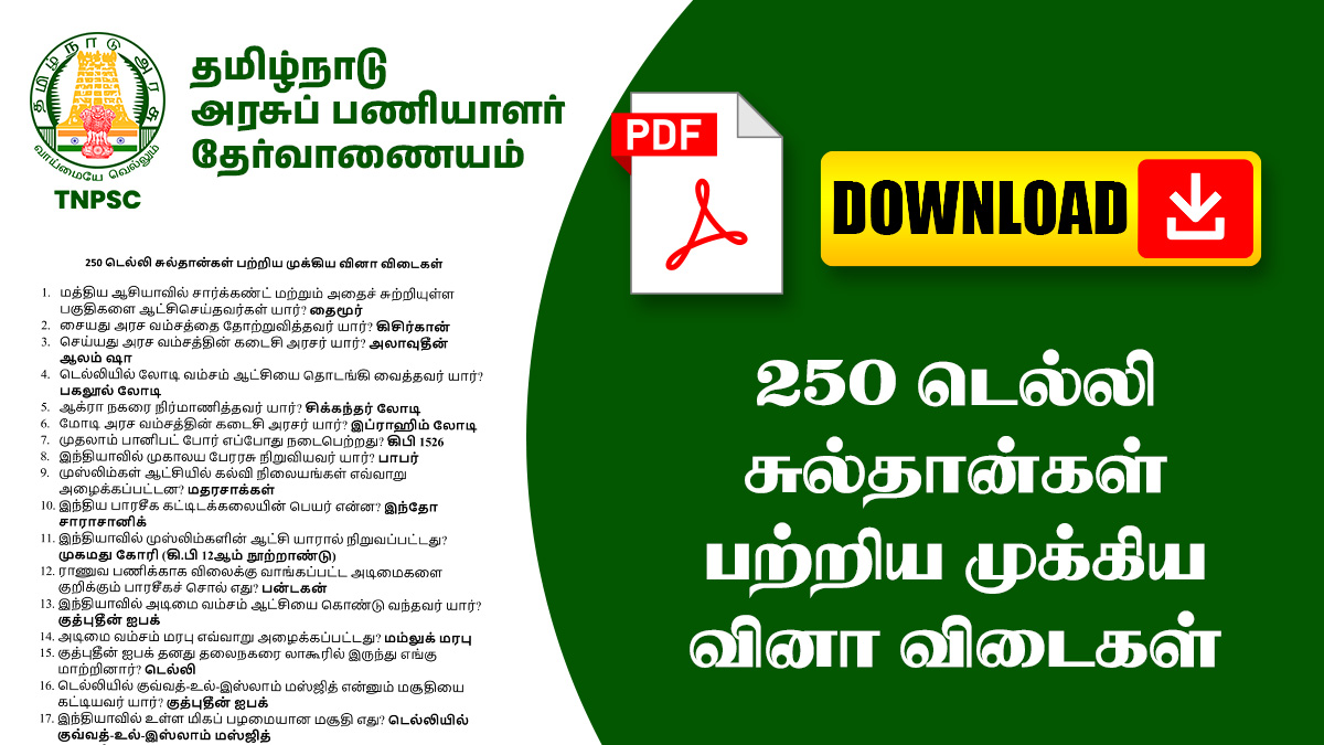 🚀 250 டெல்லி சுல்தான்கள் பற்றிய முக்கிய வினா விடைகள் – பதிவிறக்கம் செய்து, உங்கள் தேர்வு தயாரிப்பை மேம்படுத்துங்கள்!