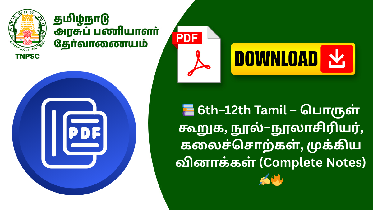 HomeNotesAll Exam Notes📚 6th–12th Tamil – பொருள் கூறுக, நூல்–நூலாசிரியர், கலைச்சொற்கள், முக்கிய வினாக்கள் (Complete Notes)...
