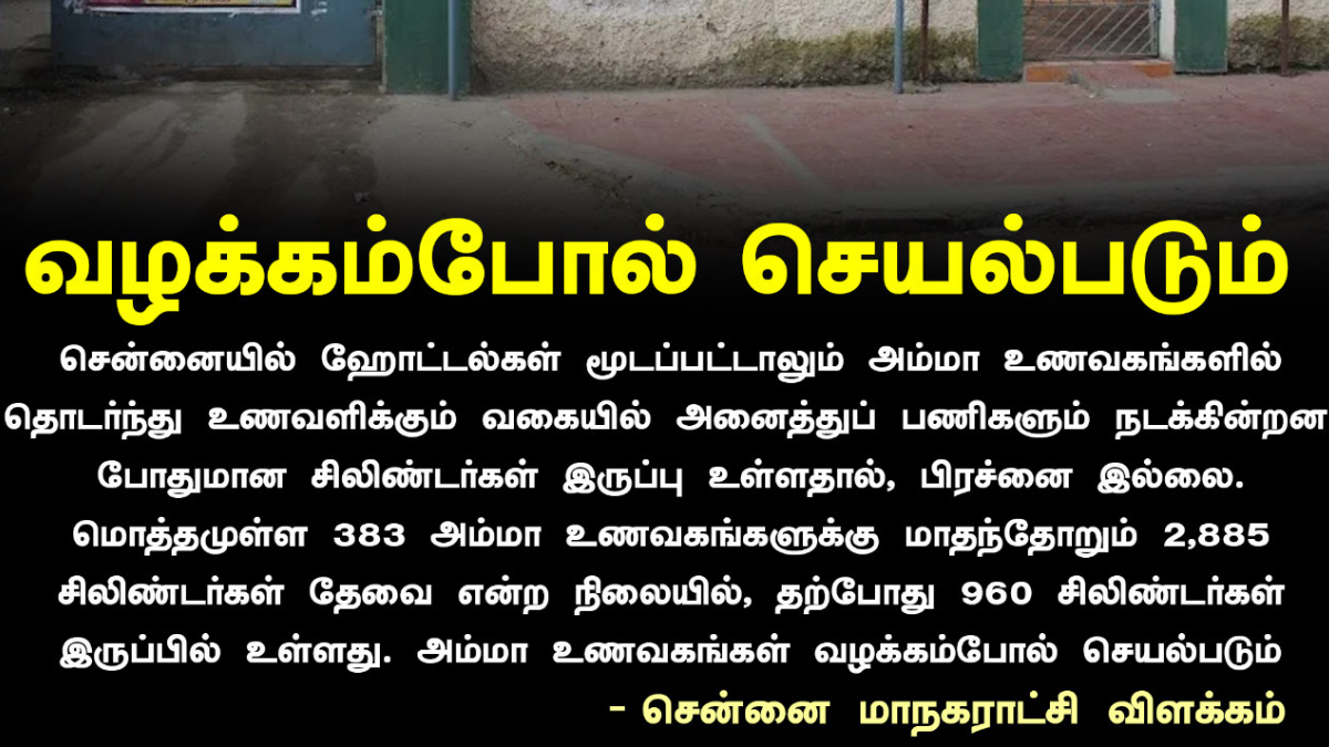அம்மா உணவகங்களில் ஹோட்டல்கள் மூடப்பட்டதாகவும், பணியாளர்கள் இல்லாததால் சேவை பாதிக்கப்பட்டதாகவும் சமூக ஊடகங்களில் பரவி வரும் தகவல்கள் உண்மையல்ல என்று மாநகராட்சி தெரிவித்துள்ளது.