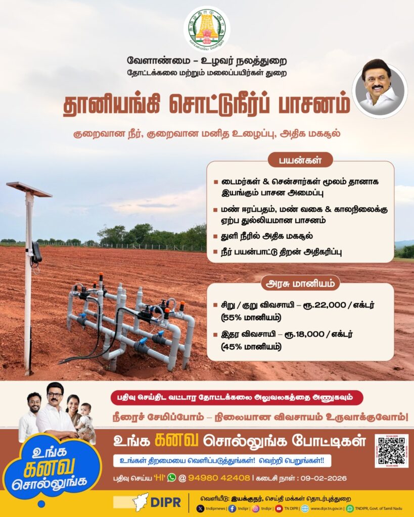 விவசாயத்தில் நீர் மேலாண்மை மிக முக்கியமானதாக மாறி வரும் இக்காலத்தில், தமிழ்நாடு அரசு விவசாயிகளின் நலனை கருத்தில் கொண்டு தானியங்கி சொட்டுநீர் பாசனத் திட்டத்தை நடைமுறைப்படுத்தி வருகிறது. இந்த திட்டம், குறைவான நீரில் அதிக மகசூல் பெறவும், மனித உழைப்பை குறைக்கவும் உதவுகிறது.