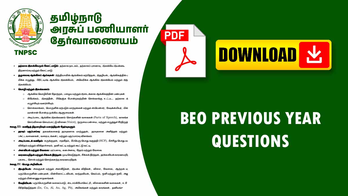இந்தப் பதிவில் BEO Previous Year Questions PDF past exams-ல வந்த GS, Tamil, Education-related questions எல்லாம் chapter-wise neatly compile பண்ணப்பட்டுள்ளது.