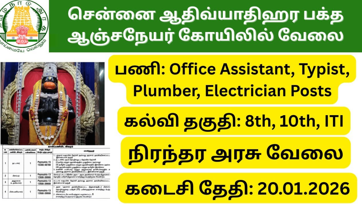 சென்னை நங்கநல்லூரில் அமைந்துள்ள Arulmigu Adhivyadhihara Bhaktha Anjaneyar Temple திருக்கோயிலில் காலியாக உள்ள 04 அரசு பணியிடங்களை நிரப்புவதற்கான அதிகாரப்பூர்வ அறிவிப்பு வெளியிடப்பட்டுள்ளது.