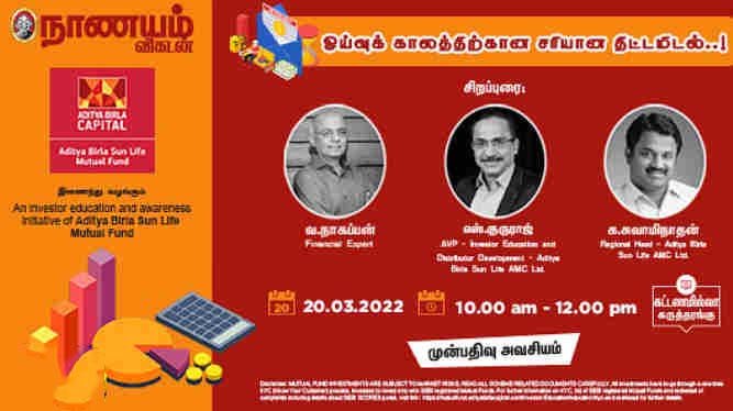 அந்தக் கேள்விகளுக்கெல்லாம் பதில் அளிக்கும் விதமாக நாணயம் விகடன் மற்றும் ஆதித்ய பிர்லா சன் லைஃப் மியூச்சுவல் ஃபண்ட் இணைந்து, `ஓய்வுக் காலத்திற்கான சரியான திட்டமிடல்..!’ என்ற ஆன்லைன் நிகழ்ச்சியை நடத்த திட்டமிட்டுள்ளன. வருகிற மார்ச் 20-ம் தேதி (ஞாயிற்றுக்கிழமை) காலை 10.00 மணி முதல் மதியம் 12.00 மணி வரை இந்த ஆன்லைன் நிகழ்ச்சி நடைபெறுகிறது.