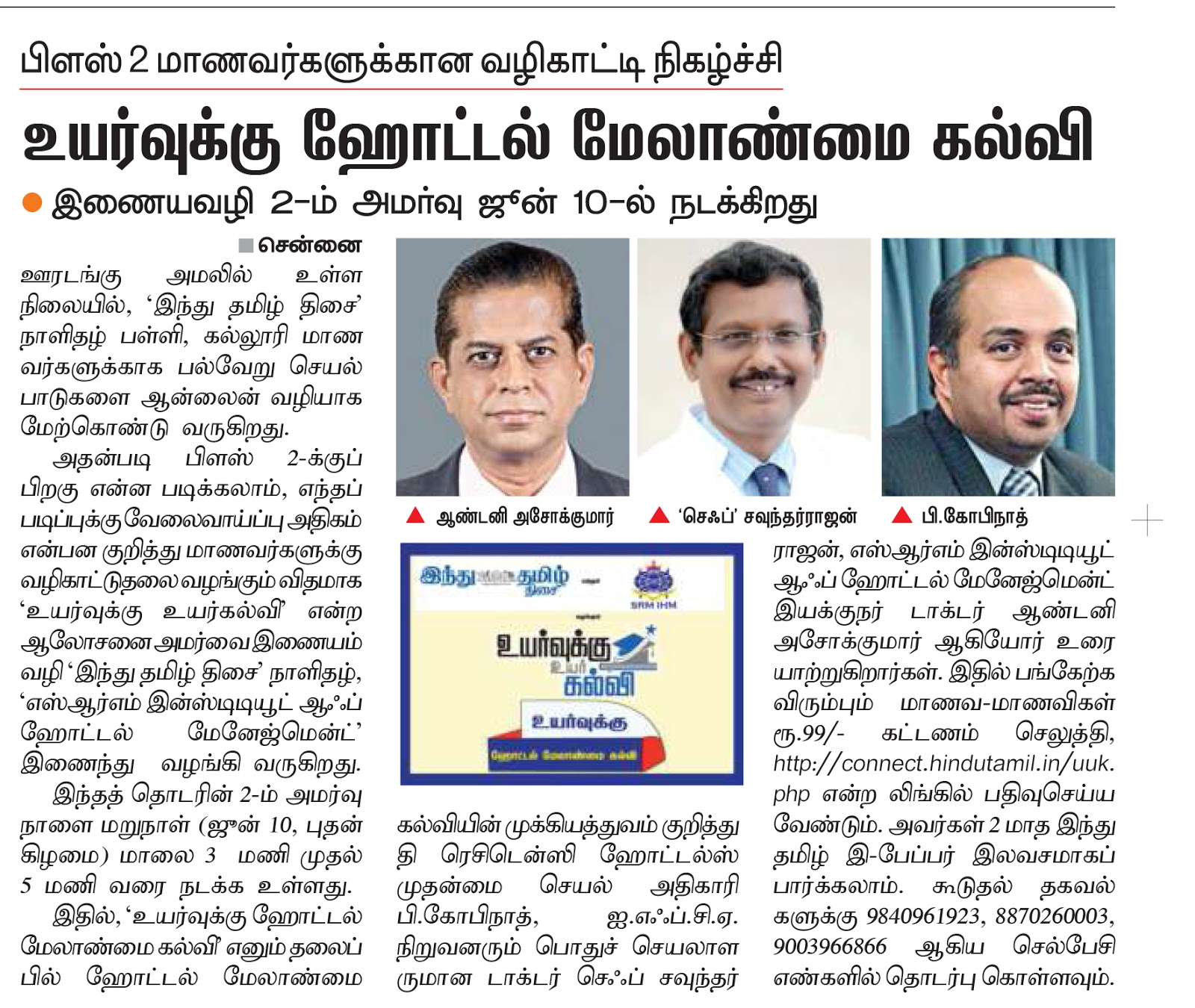அதன்படி பிளஸ் 2-க்குப் பிறகு என்ன படிக்கலாம், எந்தப் படிப்புக்கு வேலைவாய்ப்பு அதிகம் என்பன குறித்து மாணவர்களுக்கு வழிகாட்டுதலை வழங்கும் விதமாக ‘உயர்வுக்கு உயர்கல்வி’ என்ற ஆலோசனை அமர்வை இணையம் வழி ‘இந்து தமிழ் திசை’ நாளிதழ், ‘எஸ்ஆர்எம் இன்ஸ்டிடியூட் ஆஃப் ஹோட்டல் மேனேஜ்மென்ட்’ இணைந்து வழங்கி வருகிறது. இந்தத் தொடரின் 2-ம் அமர்வு நாளை மறுநாள் (ஜூன் 10, புதன் கிழமை) மாலை 3 மணி முதல் 5 மணி வரை நடக்க உள்ளது.