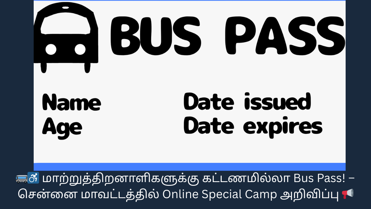 👉 நடப்பாண்டில் தகுதியுள்ள மாற்றுத்திறனாளிகள் எளிதாக & சிரமமின்றி Bus Pass பெற இந்த சிறப்பு முகாம் ஏற்பாடு செய்யப்பட்டுள்ளது.