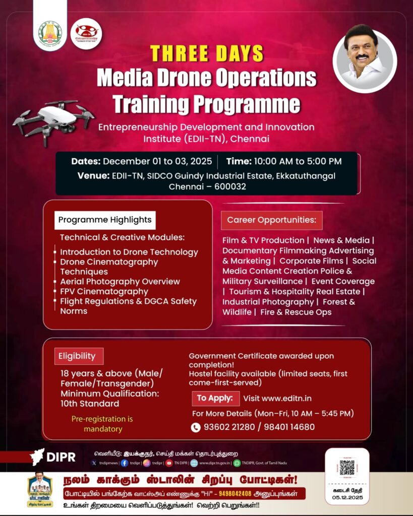 டிசம்பர் 1 முதல் 3 வரை – ட்ரோன் தொழில்நுட்பத்தில் கரியர் உருவாக்க விரும்புவோருக்கு பெரிய வாய்ப்பு!