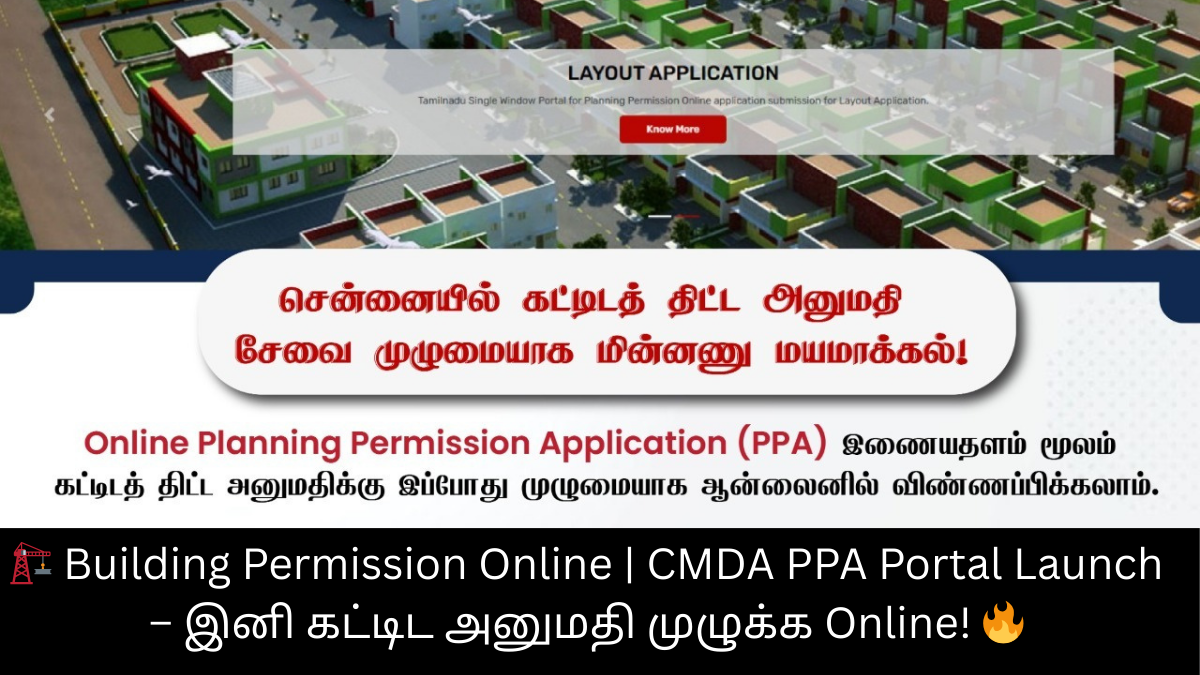 CMDA – Online PPA Portal மூலம் கட்டிட அனுமதி சேவைகள் முழுமையாக மின்னணுவாக்கம் செய்யப்பட்டுள்ளதாக தமிழ்நாடு அரசு அறிவித்துள்ளது. ⚡