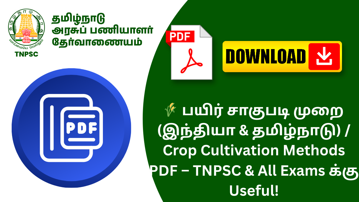 இந்த பயிர் சாகுபடி முறை – இந்தியா & தமிழ்நாடு / Crop Cultivation Methods PDFல், இந்தியா மற்றும் தமிழ்நாட்டில் பயன்படுத்தப்படும் முக்கிய வேளாண்மை முறைகள் Tamil + English mix format-ல் விரிவாக கொடுக்கப்பட்டுள்ளன. இதில் Traditional farming, Modern cultivation, Organic farming, Mixed cropping, Crop rotation, Irrigation methods, Soil types, Climate requirements போன்ற தலைப்புகள் தெளிவாக விளக்கப்பட்டுள்ளன.