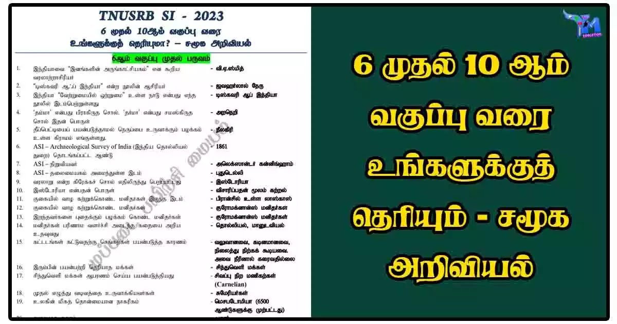 6 முதல் 10 ஆம் வகுப்பு வரை உங்களுக்குத் தெரியும் சமூக அறிவியல் பதிவிறக்க PDF குறிப்புகளை இலவசமாக பகிர்கிறோம். இந்த குறிப்புகள் TNPSC தேர்வுகள் – குரூப் 1, குரூப்2, குரூப் 4, TNUSRB கான்ஸ்டபிள் மற்றும் SI, TN forest, ரயில்வே, வங்கி போன்ற அனைத்து அரசு தேர்வுகளுக்கும் உதவும். அனைத்து PDF குறிப்புகளும் இணையத்தில் வேறு நபர்களால் பகிரப்பட்டவை.