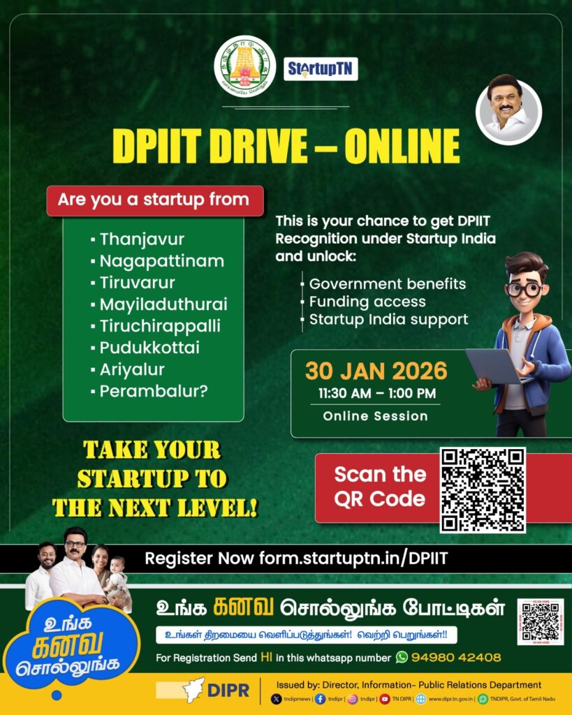 தமிழ்நாடு அரசு ஆதரவுடன் செயல்படும் StartupTN சார்பில், DPIIT Drive – Online 2026 என்ற முக்கியமான Online Awareness & Registration Session அறிவிக்கப்பட்டுள்ளது.