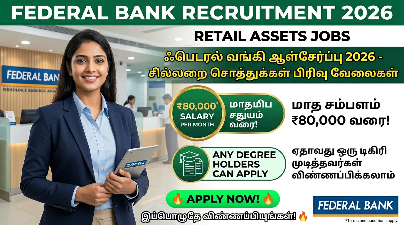 🔥 Private Bank-ல் High Salary Job தேடுறவர்களுக்கு நல்ல வாய்ப்பு! Federal Bank 2026 ஆம் ஆண்டிற்கான Retail Assets (Secured) பணியிடங்களுக்கு விண்ணப்பங்களை வரவேற்கிறது. Banking & Sales அனுபவம் உள்ளவர்களுக்கு இது ஒரு Great Career Opportunity!