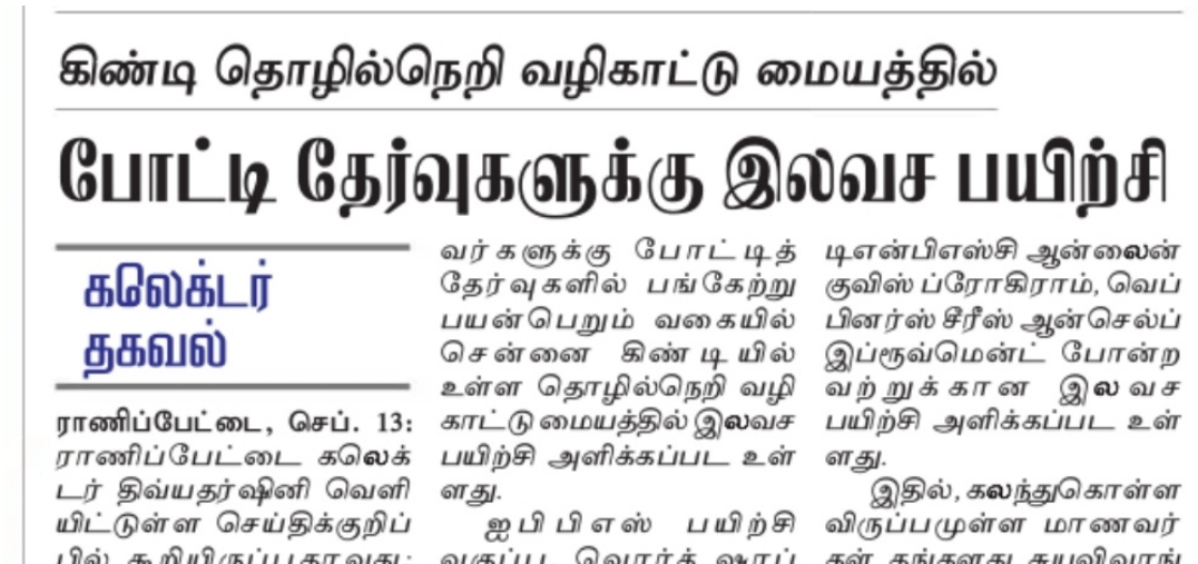 வேலூர் மாவட்ட வேலை வாய்ப்பு மற்றும் தொழில் நெறி வழிகாட்டும் மையம் சார்பில் இணைய வழியாக இயங்கிவரும் போட்டித்தேர்வு பயிற்சி வகுப்புகளில் பங்குபெறும் மாணவர்களுக்கு போட்டித் தேர்வுகளில் பங்கேற்று பயன்பெறும் வகையில் சென்னை கிண்டியில் உள்ள தொழில்நெறி வழிகாட்டு மையத்தில் இலவச பயிற்சி அளிக்கப்பட உள்ளது.
