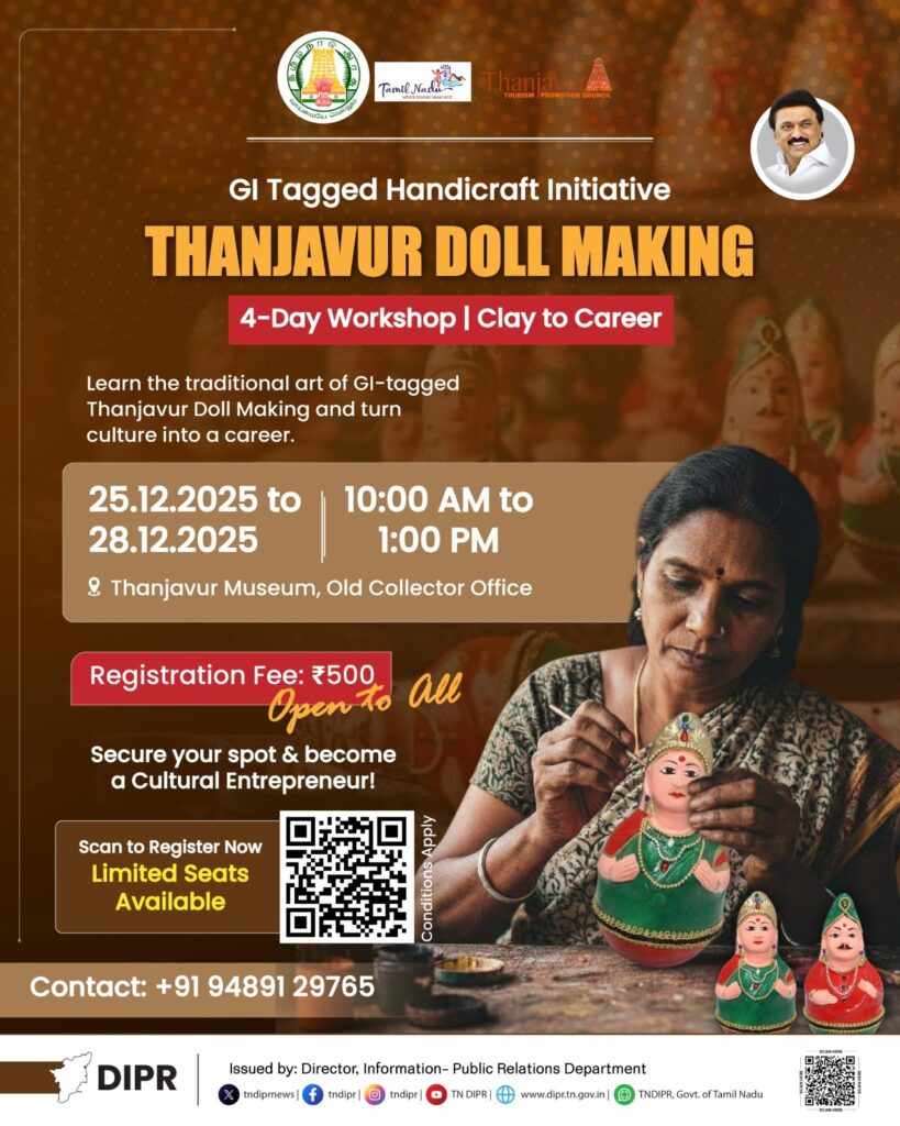 GI Tag பெற்ற தஞ்சாவூர் பொம்மை தயாரிப்பு (Thanjavur Doll Making) என்ற உலகப் புகழ்பெற்ற பாரம்பரிய கலைகளை நேரடியாக கற்றுக்கொள்ள 4 நாள் சிறப்பு பயிற்சி முகாம் நடத்தப்படுகிறது.