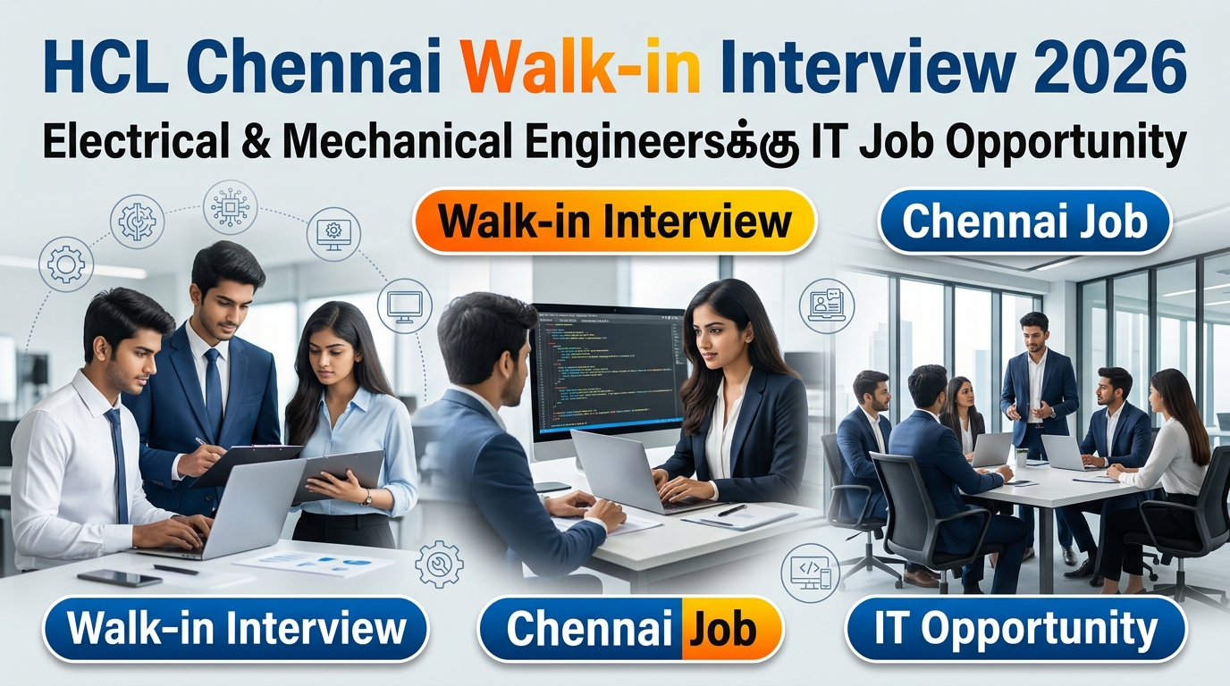 🔥 IT துறையில் வேலை செய்ய விரும்புறவர்களுக்கான Super வாய்ப்பு! HCL Chennai நிறுவனத்தில் Electrical & Mechanical Engineersக்கு நேரடி Walk-in Interview அறிவிக்கப்பட்டுள்ளது. IT Field-க்கு மாற்றம் செய்ய நினைப்பவர்களுக்கு இது ஒரு Golden Chance!
