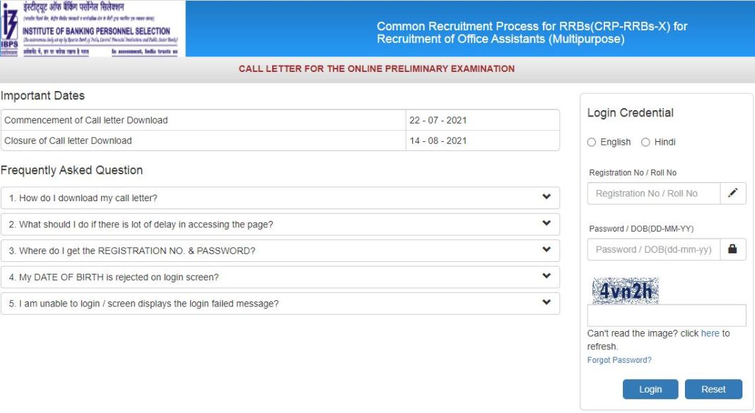 வங்கி பணியாளர் தேர்வு நிறுவனம் (ஐ.பி.பி.எஸ்) ஆனது எழுத்தர் அல்லது அலுவலக உதவியாளர் பதவிக்கான தேர்வு நுழைவுச்சீட்டை தற்போது வெளியிட்டுள்ளது. விண்ணப்பதாரர்கள் 22.07.2021 முதல் 14.08.2021 வரை அழைப்பு கடிதத்தை பதிவிறக்கம் செய்யலாம்.