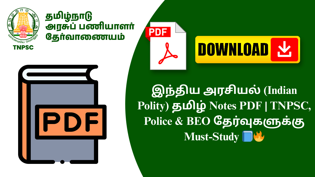 இந்த PDF-ல் இந்திய அரசியல் (Indian Polity) பற்றிய அனைத்து முக்கிய கருத்துகளும் தமிழில் எளிமையாகவும் தேர்வு நோக்கில் பயன்படுத்தக்கூடியதாகவும் வழங்கப்பட்டுள்ளன. TNPSC Group Exams, TNUSRB Police, BEO, TRB, TET, RRB போன்ற போட்டித் தேர்வுகளில் Polity பகுதியில் அதிக கேள்விகள் வருவதால் இந்த PDF மிகப் பயனுள்ளதாக இருக்கும்.