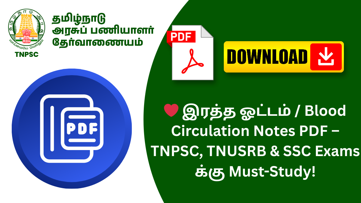 இந்த இரத்த ஓட்டம் / Blood Circulation Notes PDFயில் மனித உடலின் circulation system பற்றிய முழு விளக்கங்களும் Tamil + English mix format-ல் எளிதாக கொடுக்கப்பட்டுள்ளன. இதில் Heart Structure, Chambers, Valves, Arteries, Veins, Blood Flow Path, Oxygenated & Deoxygenated Blood, Pulse, Blood Pressure போன்ற முக்கிய பகுதிகள் தெளிவாக விளக்கப்பட்டுள்ளன.