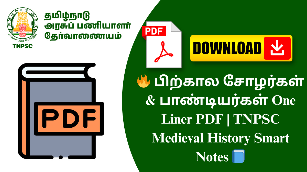இந்த பிற்கால சோழர்கள் & பாண்டியர்கள் One Liner PDF என்பது TNPSC மற்றும் பிற Group தேர்வுகளுக்காக Medieval Tamil Nadu History பகுதியை மையமாக கொண்டு தயாரிக்கப்பட்ட exam-focused study material ஆகும். இதில் பிற்கால சோழர்களும் பாண்டியர்களும் ஆட்சி செய்த காலத்தில் ஏற்பட்ட அரசியல், நிர்வாக, பொருளாதார, சமூக மற்றும் கலாச்சார வளர்ச்சிகள் சுருக்கமாக தொகுக்கப்பட்டுள்ளன.