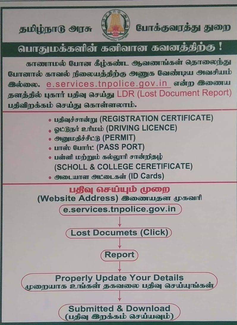பதிவுச்சான்று (ஆர்.சி.,) ஓட்டுனர் உரிமம், (லைசென்ஸ்) அனுமதிச்சீட்டு(பர்மிட்) பாஸ்போர்ட், பள்ளி மற்றும் கல்லுாரி சான்றிதழ், அடையாள அட்டை ஆகியவை தொலைந்து விட்டால், e.services.tnpolice.gov.in என்ற இணையத்தில் புகார் செய்து, lost document report பதிவிறக்கம் செய்து கொள்ளலாம்.