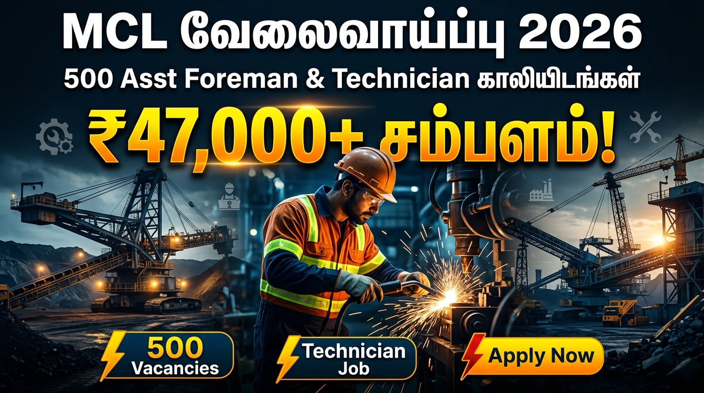 Coal India subsidiary ஆன Mahanadi Coalfields Limited (MCL) தற்போது 500 Assistant Foreman & Technician (Electrician) பணியிடங்களுக்கு வேலைவாய்ப்பு அறிவித்துள்ளது. Diploma அல்லது ITI முடித்தவர்களுக்கு இது ஒரு பெரிய அரசு வேலை வாய்ப்பு. நல்ல சம்பளம் + CBT மூலம் தேர்வு என்பதால் இந்த வாய்ப்பை தவற விடாதீர்கள்!