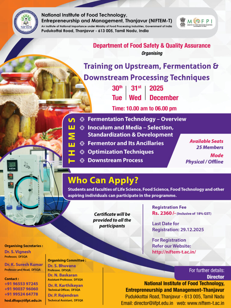 உணவு தொழில்நுட்பம், பயோடெக் மற்றும் fermentation-based industries-ல் முன்னேற விரும்பும் மாணவர்கள் மற்றும் ஆராய்ச்சியாளர்களுக்காக National Institute of Food Technology, Entrepreneurship and Management – Thanjavur (NIFTEM–T), Upstream, Fermentation & Downstream Processing Techniques எனும் 3 நாள் intensive training programme-ஐ அறிவித்துள்ளது.