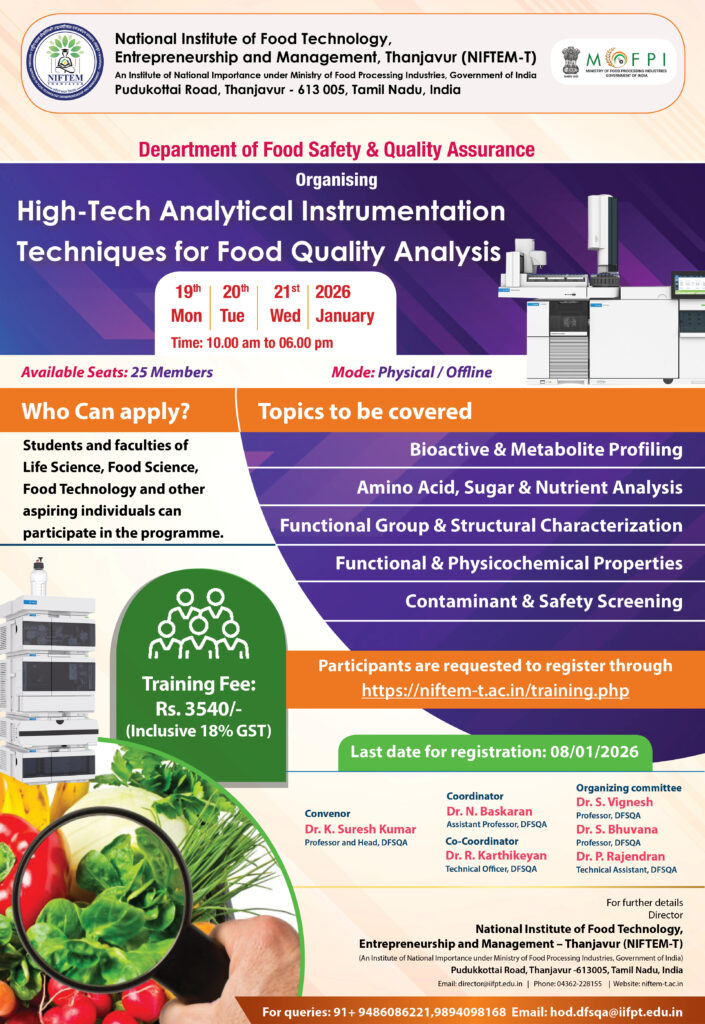உணவு பாதுகாப்பு மற்றும் தரப்பரிசோதனை துறையில் முன்னணி தேசிய நிறுவனமான National Institute of Food Technology, Entrepreneurship and Management – Thanjavur (NIFTEM–T), High-Tech Analytical Instrumentation Techniques for Food Quality Analysis எனும் 3 நாள் intensive training program-ஐ அறிவித்துள்ளது.