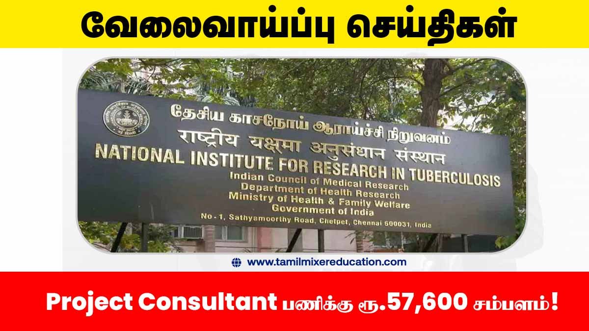 சென்னையில் செயல்படும் தேசிய காசநோய் ஆராய்ச்சி நிறுவனம் (NIRT) -ல் Project Consultant (Data Manager) பணியிடத்திற்கு விண்ணப்பங்கள் வரவேற்கப்படுகின்றன. மொத்த காலியிடம் – 1 மட்டுமே. ஆர்வமுள்ளவர்கள் ஆன்லைன் வாயிலாக விண்ணப்பிக்கலாம்.