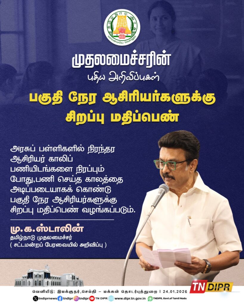 அரசுப் பள்ளிகளில் பணியாற்றி வரும் பகுதி நேர ஆசிரியர்களுக்கு தமிழ்நாடு அரசு முக்கியமான நற்செய்தியை அறிவித்துள்ளது. நிரந்தர ஆசிரியர் காலிப் பணியிடங்களை நிரப்பும் போது, பகுதி நேர ஆசிரியர்கள் இதுவரை செய்த பணி அனுபவத்தை அடிப்படையாகக் கொண்டு, அவர்களுக்கு சிறப்பு மதிப்பெண் (Special Marks) வழங்கப்படும் என தமிழ்நாடு முதலமைச்சர் மு.க. ஸ்டாலின் அறிவித்துள்ளார்.