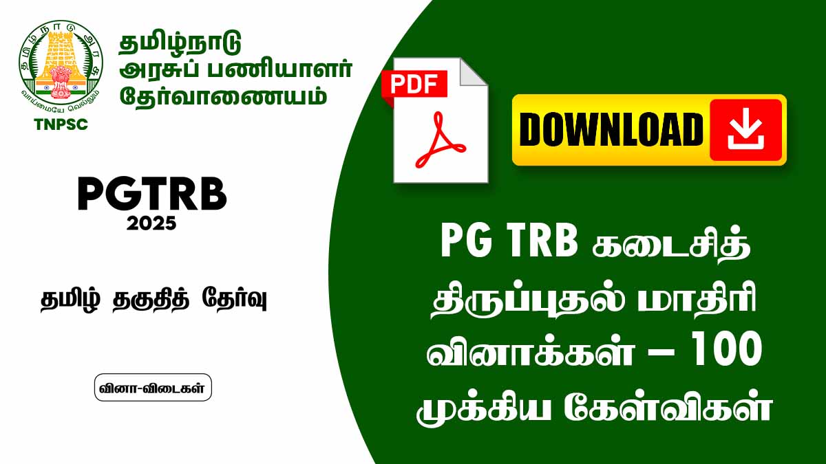 PG TRB (Post Graduate Teacher Recruitment Board) தேர்வுக்கான கடைசித் திருப்புதல் (Last Revision) மாதிரி வினாக்கள் – 100 முக்கிய கேள்விகள் தொகுப்பு PDF இங்கு வழங்கப்பட்டுள்ளது. இந்த வினாக்கள், தேர்வுக்கு முன் ஒரு முறை திருப்பிப் பார்க்க வேண்டிய முக்கிய தலைப்புகளை அடிப்படையாகக் கொண்டு தொகுக்கப்பட்டுள்ளன.