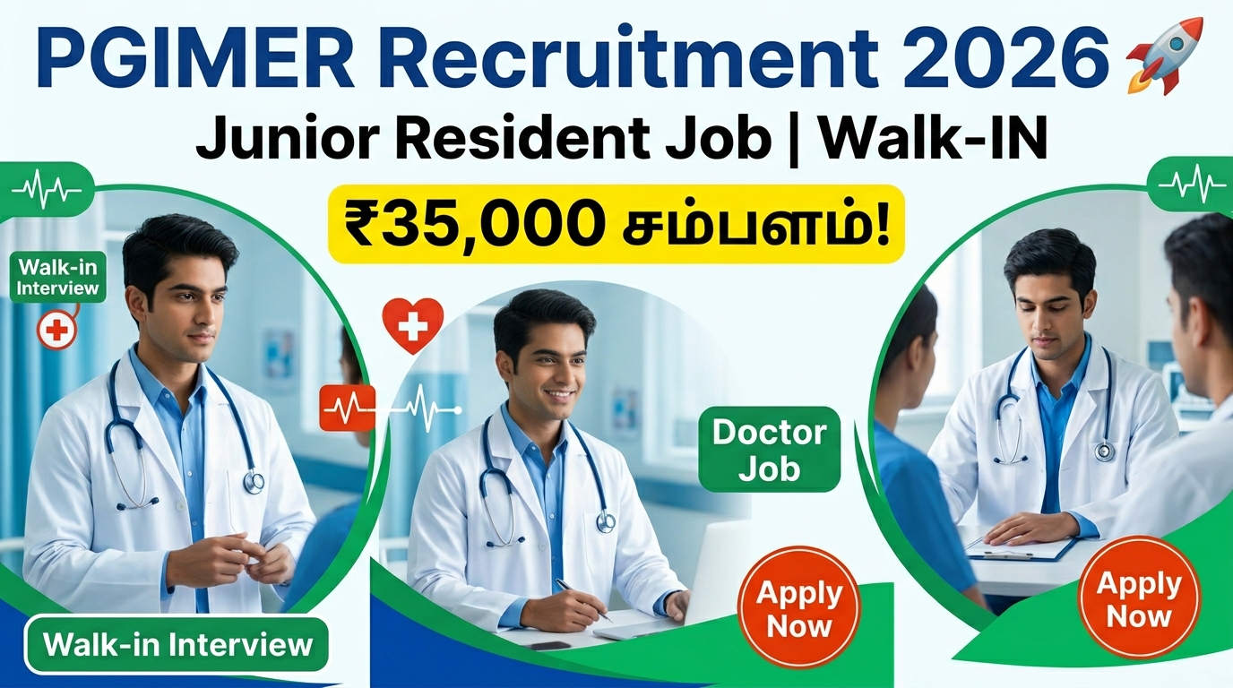 முக்கியமான மருத்துவ கல்வி மற்றும் ஆராய்ச்சி நிறுவனமான Postgraduate Institute of Medical Education and Research (PGIMER) தற்போது Junior Resident பணியிடத்திற்கு வேலைவாய்ப்பு அறிவித்துள்ளது. MBBS முடித்தவர்களுக்கு இது ஒரு நல்ல ஆரம்ப Government Medical Job!
