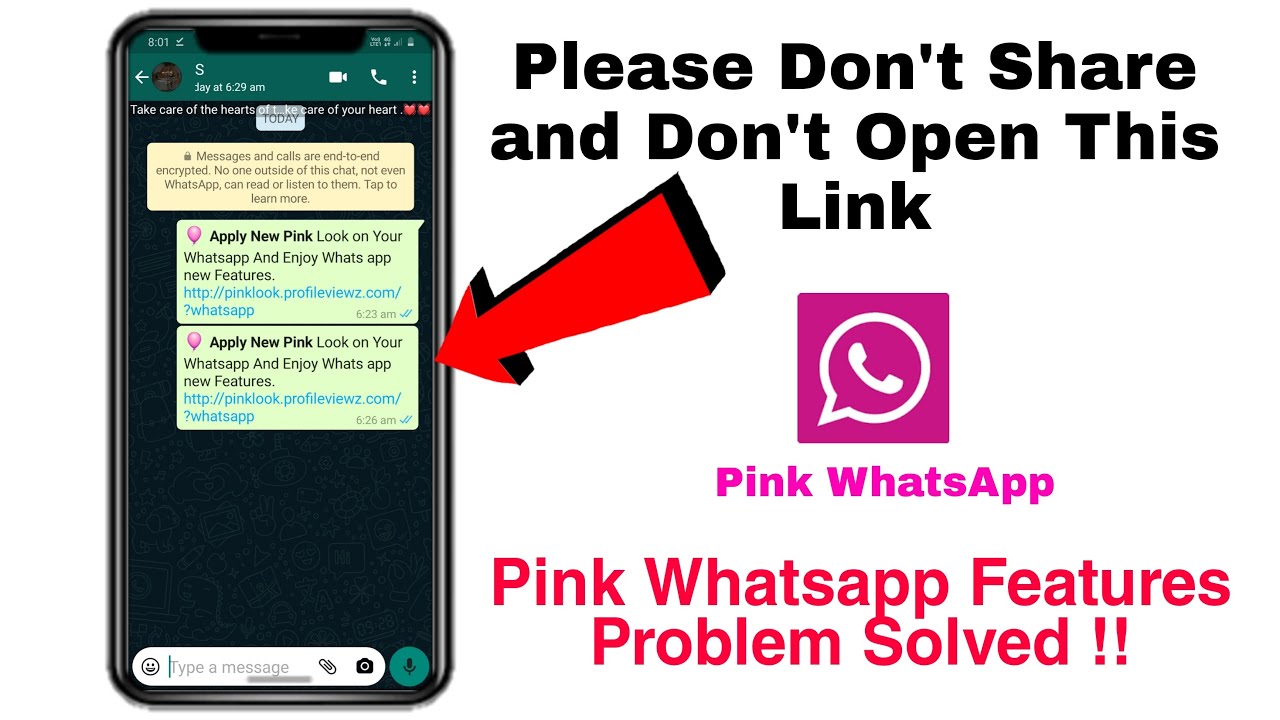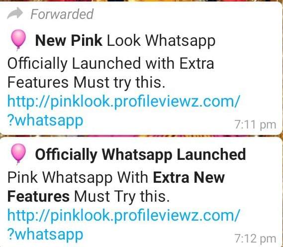 அதில், குழு நண்பர்களின் கவனத்திற்கு, அதிகாரப்பூர்வமாக வாட்ஸ்ஆப் நிறுவனத்தின் பிங்க் வாட்ஸ்ஆப்பில், கூடுதல் புதிய அம்சங்களுடன் அறிமுகப்படுத்தியுள்ளது என என்ற லிங்க் வந்துள்ளது.