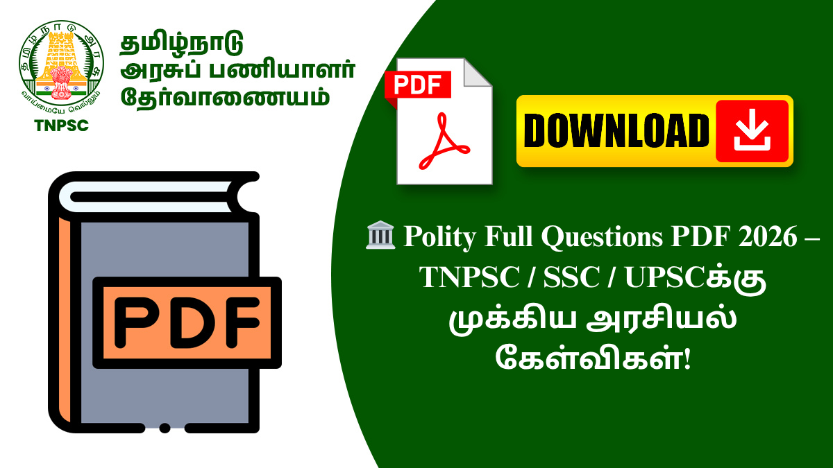 👉 இந்த Polity Full Questions PDF-ஐ இப்போது download செய்து உங்கள் தேர்வு தயாரிப்பை strong ஆக மாற்றுங்கள்! 🚀