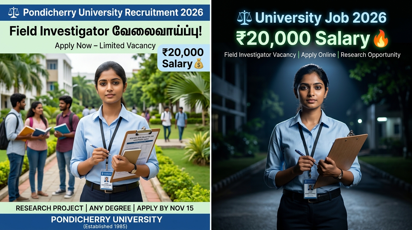 Pondicherry University சார்பில் 2026ஆம் ஆண்டிற்கான Field Investigator பணியிடத்திற்கான வேலைவாய்ப்பு அறிவிப்பு வெளியாகியுள்ளது.