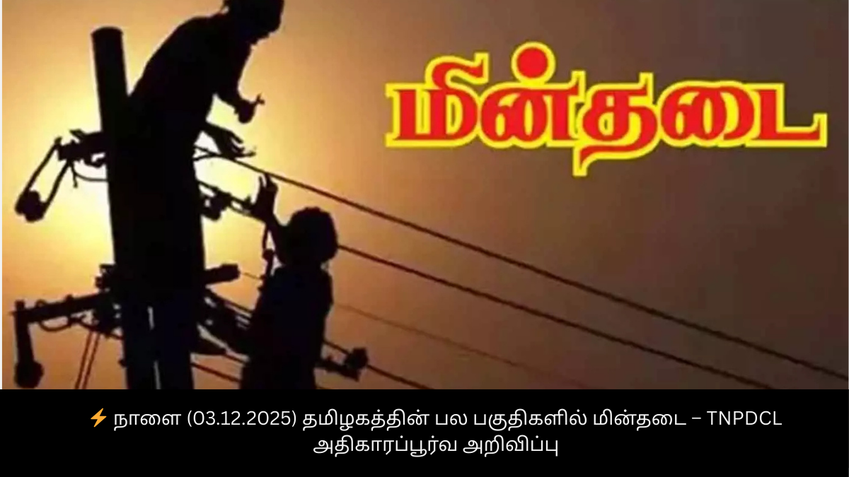 தமிழக மின்சார வாரியம் (TNPDCL) அறிவித்துள்ளதன்படி, நாளை 03 டிசம்பர் 2025 (புதன்கிழமை) மாநிலத்தின் சில பகுதிகளில் மாதாந்திர மின் பாதை பராமரிப்பு பணிகள் காரணமாக பகல் நேர மின்தடை அமல்படுத்தப்பட்டுள்ளது. பொதுமக்கள் முன்கூட்டியே தேவையான ஏற்பாடுகளை செய்துகொள்ளுமாறு அறிவுறுத்தப்பட்டுள்ளது.