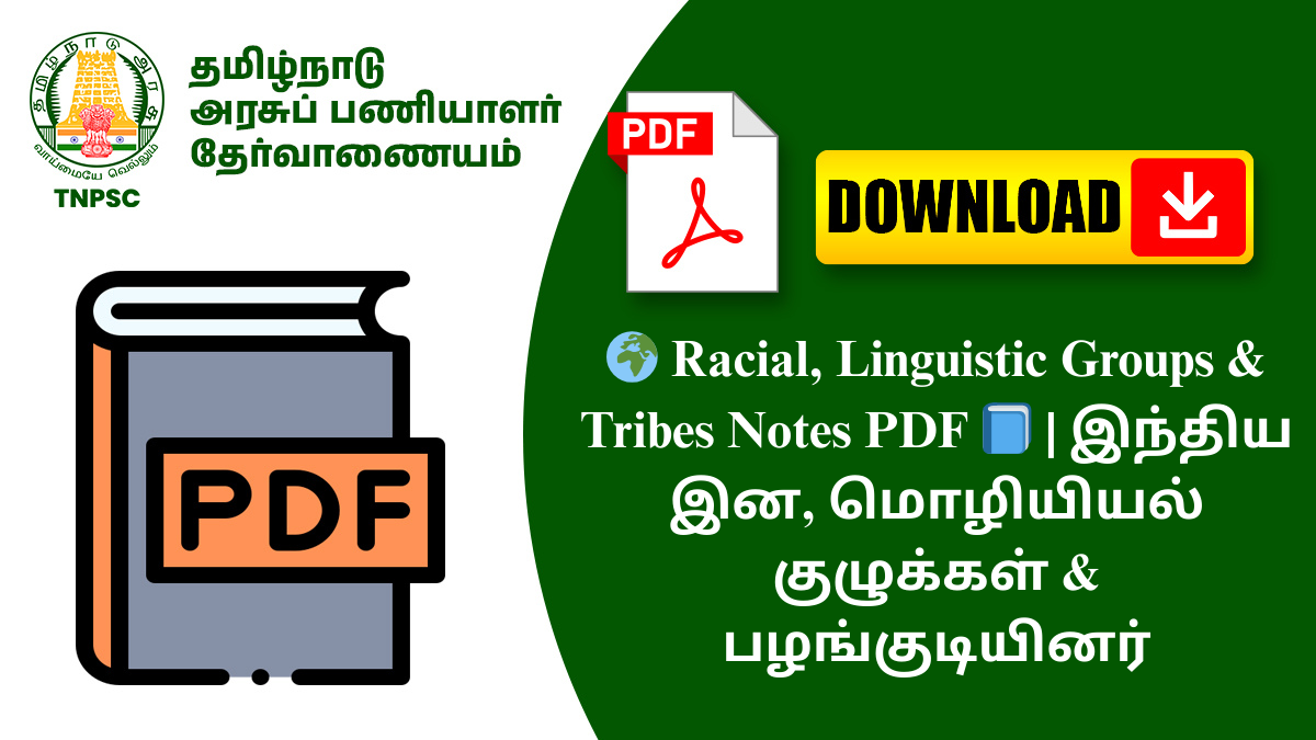 இந்த Racial, Linguistic Groups & Tribes – இன, மொழியியல் குழுக்கள் மற்றும் பழங்குடியினர் Notes PDF-ல், இந்தியாவின் சமூக–மனிதவியல் (Anthropology) பின்னணியை அமைக்கும் இனக்குழுக்கள், மொழிக் குடும்பங்கள், பழங்குடியினர் வாழ்க்கை முறை மற்றும் அவர்கள் பங்குகள் பற்றிய முழுமையான விளக்கங்கள் சேர்க்கப்பட்டுள்ளன. இது TNPSC Unit–8 & Geography பகுதியில் மிக முக்கியமான topic.
