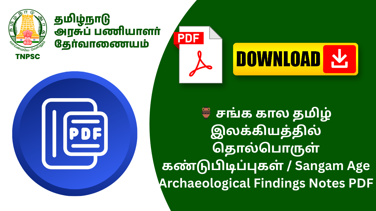 இந்த சங்க கால தமிழ் இலக்கியத்தில் தொல்பொருள் கண்டுபிடிப்புகள் / Sangam Age Archaeological Findings Notes PDFல், சங்க காலத்தை உறுதிப்படுத்தும் முக்கியமான தொல்பொருள் ஆதாரங்கள் Tamil + English mix format-ல் தெளிவாக சுருக்கமாக கொடுக்கப்பட்டுள்ளன.
