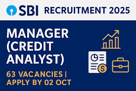 பாரத ஸ்டேட் வங்கி (SBI) 2025ஆம் ஆண்டிற்கான Manager (Credit Analyst) பணியிடங்களுக்கான வேலைவாய்ப்பு அறிவிப்பு வெளியிட்டுள்ளது. மொத்தம் 63 காலியிடங்கள் உள்ளன. விண்ணப்பதாரர்கள் ஆன்லைனில் விண்ணப்பிக்க வேண்டும்.