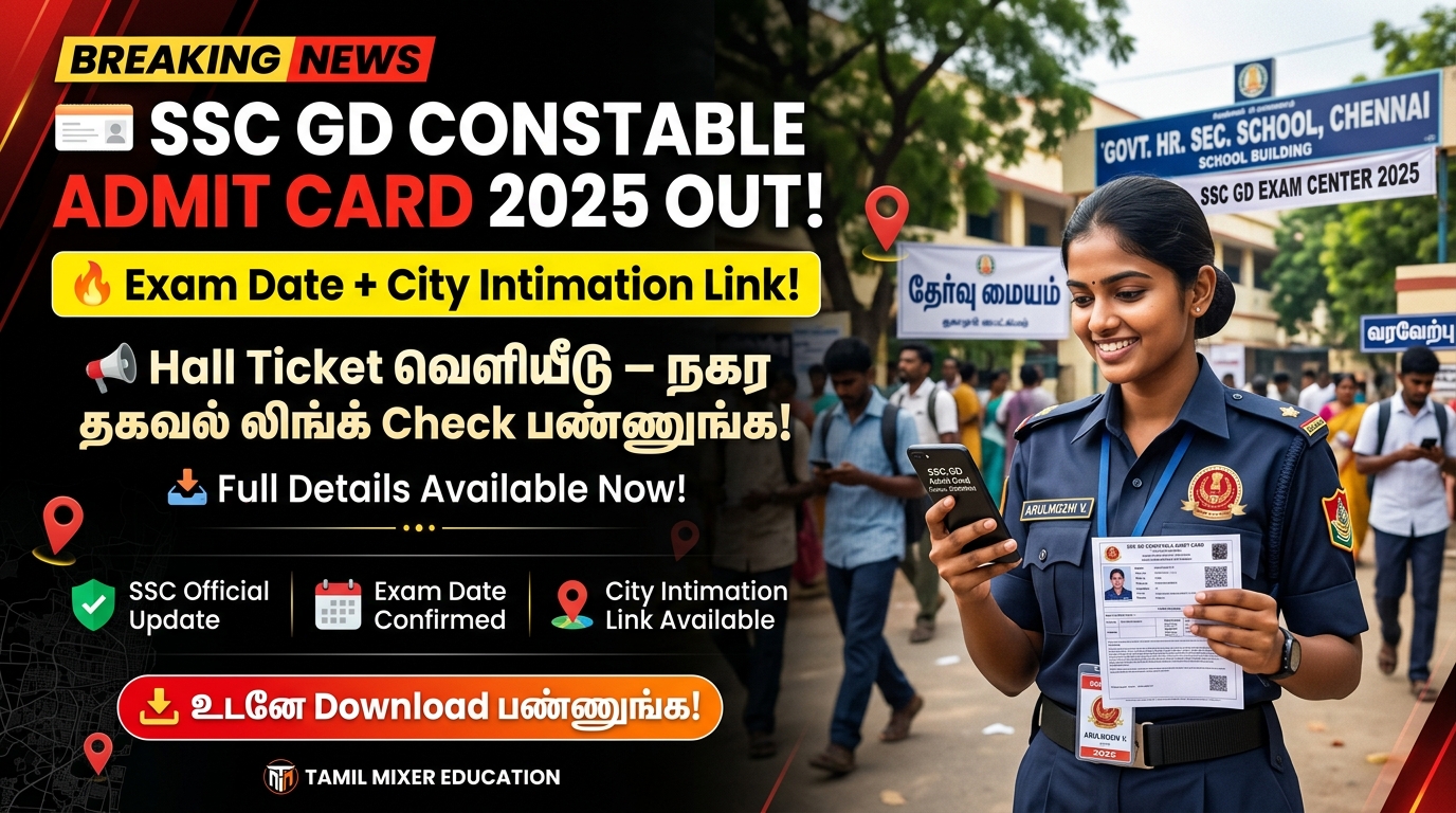 SSC Constable (GD) 2025 தேர்வுக்கான Admit Card, Exam Date மற்றும் City Intimation Link அதிகாரப்பூர்வமாக வெளியிடப்பட்டுள்ளது! 🎯 விண்ணப்பித்தவர்கள் உடனே update check செய்து preparation தொடங்க வேண்டும்.