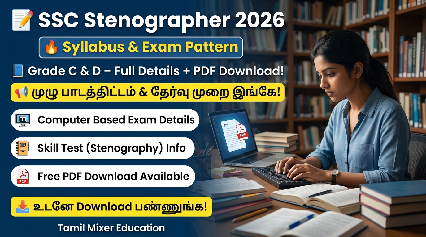 SSC Stenographer Grade ‘C’ & ‘D’ Examination 2026 க்கான Syllabus மற்றும் Exam Pattern அதிகாரப்பூர்வமாக வெளியிடப்பட்டுள்ளது. தேர்வுக்கு தயாராகும் மாணவர்கள் இப்போது முழு syllabus மற்றும் exam structure ஐ தெரிந்து கொண்டு சரியான preparation ஆரம்பிக்கலாம்.