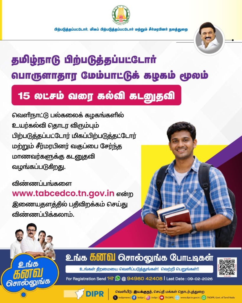 வெளிநாட்டில் உயர்கல்வி தொடர விரும்பும் மாணவர்களுக்கு தமிழ்நாடு அரசு மிக முக்கியமான அறிவிப்பை வெளியிட்டுள்ளது. தமிழ்நாடு பிற்படுத்தப்பட்டோர் பொருளாதார மேம்பாட்டுக் கழகம் (TABCEDCO) மூலம், பிற்படுத்தப்பட்டோர் (BC), மிகப்பிற்படுத்தப்பட்டோர் (MBC) மற்றும் சீர்மரபினர் (DNC) வகுப்பைச் சேர்ந்த மாணவர்களுக்கு ₹15 லட்சம் வரை கல்வி கடனுதவி வழங்கப்பட உள்ளது.