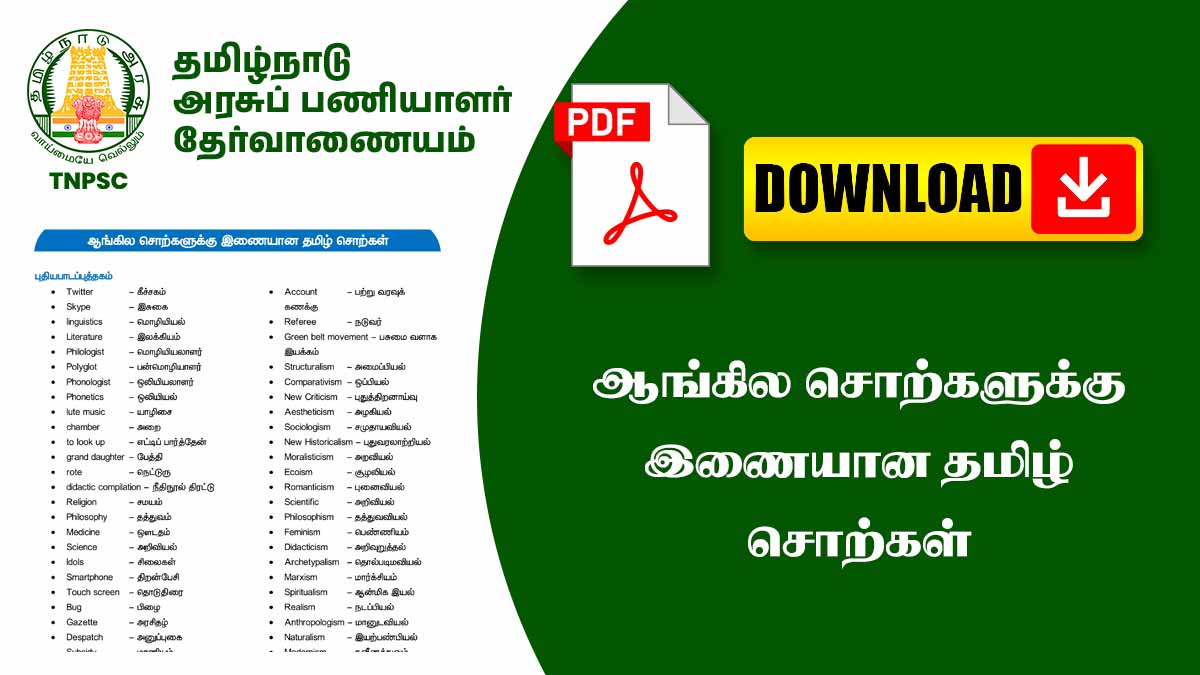 இந்தப் பதிவில் முக்கியமான 100+ ஆங்கிலச் சொற்கள் மற்றும் அவற்றின் தமிழ் அர்த்தங்கள் PDF வடிவில் கொடுக்கப்பட்டுள்ளன.