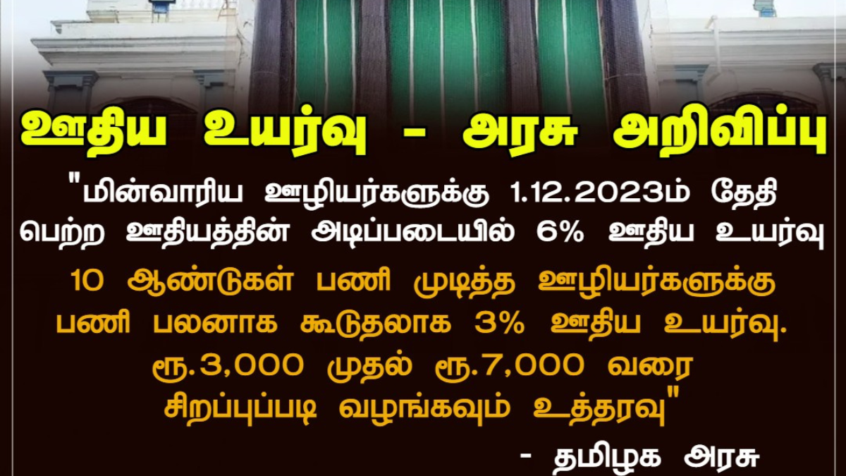 தமிழ்நாடு மின்வாரியத்தில் (TNEB) பணிபுரியும் ஊழியர்கள் மற்றும் அலுவலர்களுக்கு ஊதிய உயர்வு வழங்க தமிழக அரசு அறிவித்துள்ளது.