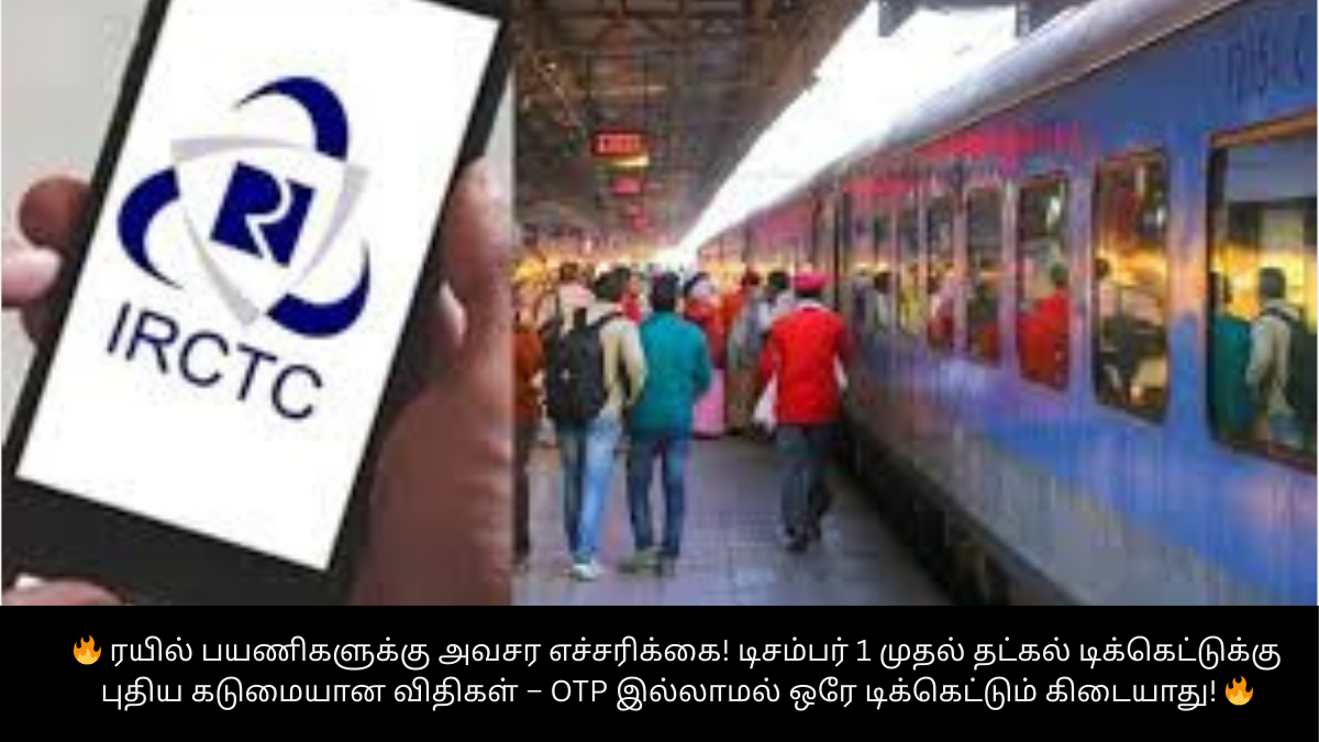 🔥 ரயில் பயணிகளுக்கு அவசர எச்சரிக்கை! டிசம்பர் 1 முதல் தட்கல் டிக்கெட்டுக்கு புதிய கடுமையான விதிகள் – OTP இல்லாமல் ஒரே டிக்கெட்டும் கிடையாது! 🔥